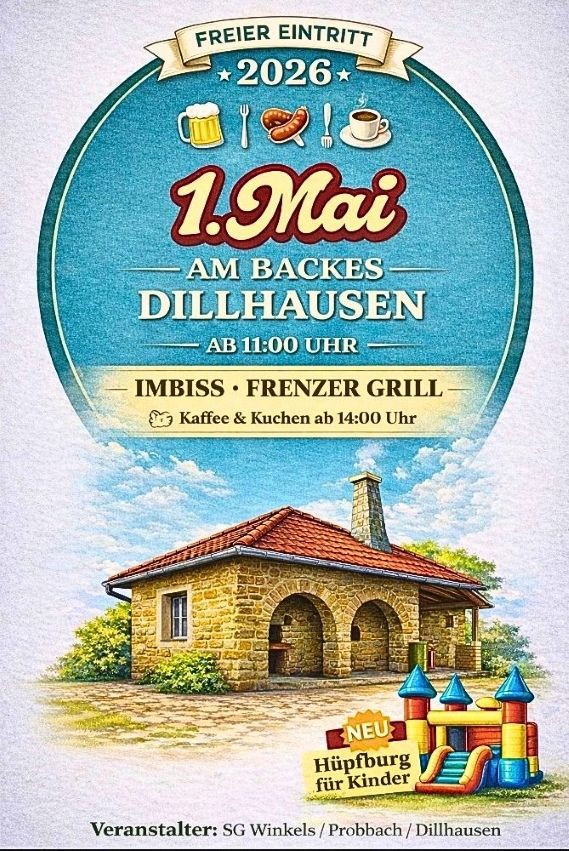 Auch in diesem Jahr lädt die SG Winkels/Probbach/Dillhausen herzlich zum traditionellen Fest am 01. Mai ab 11:00 Uhr ein. Am Maifeiertag wird Dillhausen wieder zum Treffpunkt für Wandergruppen, Stammtische, Freundeskreise und alle, die den Feiertag in geselliger Atmosphäre mit kühlen Getränken, leckerem Essen und guten Gesprächen verbringen möchten. In diesem Jahr findet das Fest im besonderen Ambiente des historischen Ortskerns von Dillhausen statt. mehr...