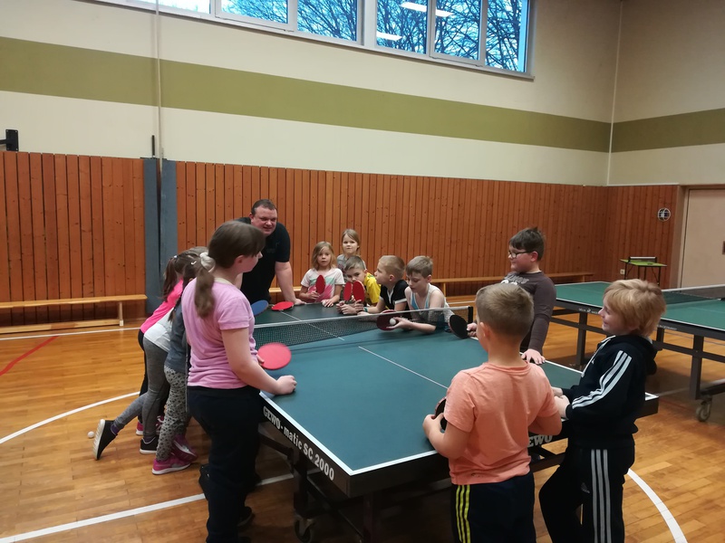 Nach einer kurzen Aufwärmphase lernten die Kinder die korrekte Schlägerhaltung, die Schlagtechnik sowie grundlegende Spielregeln kennen. Schläger, Bälle und mehrere Tischtennisplatten unterschiedlicher Größen luden dann zum Ausprobieren ein. Mit großer Begeisterung beförderten Schüler/innen und Lehrerinnen die Bälle auf den Spielflächen hin und her. Durch den Einsatz einer Ballmaschine konnte das Annehmen schnell ankommender Bälle nochmals gezielt trainiert werden. Die Mini-Tischtennisplatten stellten nicht nur für Anfänger, sondern auch für Fortgeschrittene eine große Herausforderung dar. Hier war viel Feingefühl im Umgang mit dem Schläger gefragt. Besonders gefallen hat den Schüler/innen die motivierende Hintergrundmusik, die den richtigen Schwung ins Spiel brachte.